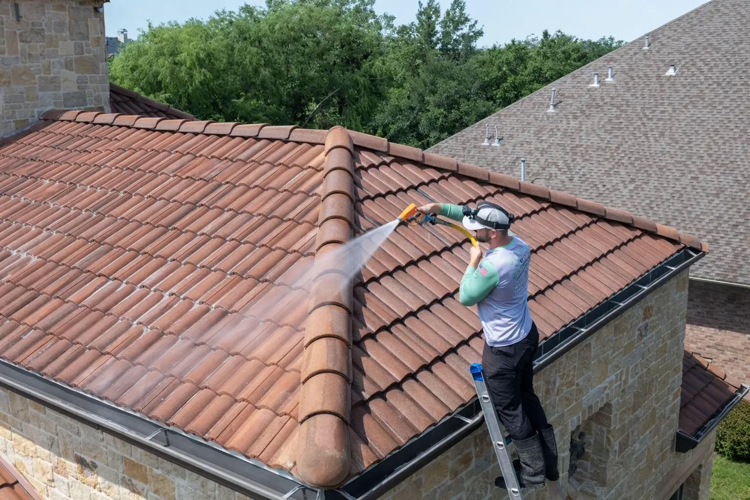 Roof soft wash is the most recommended method for asphalt shingles and tile roofs. It uses low pressure and specialized solutions to break down algae, mold, and bacteria at the root.